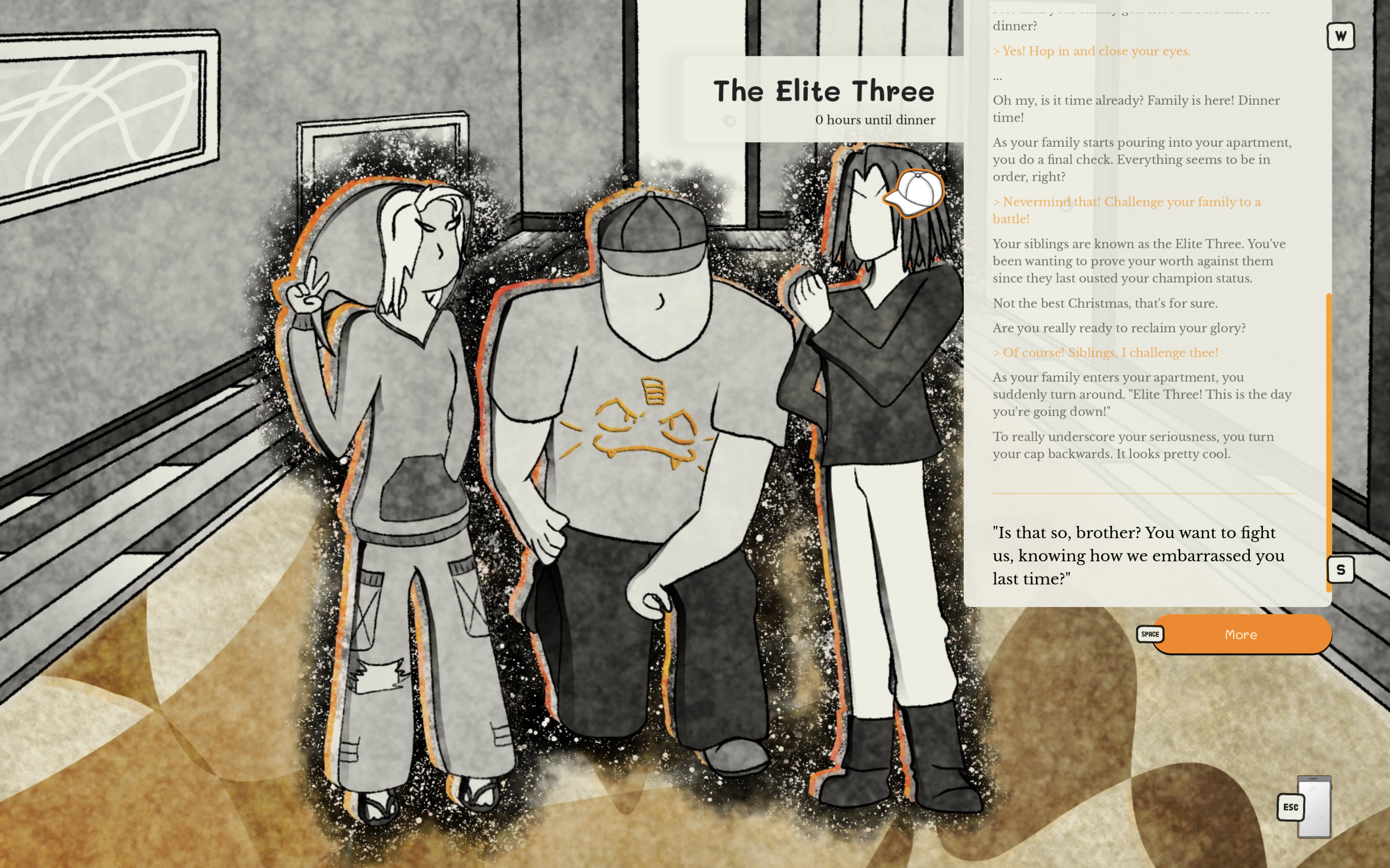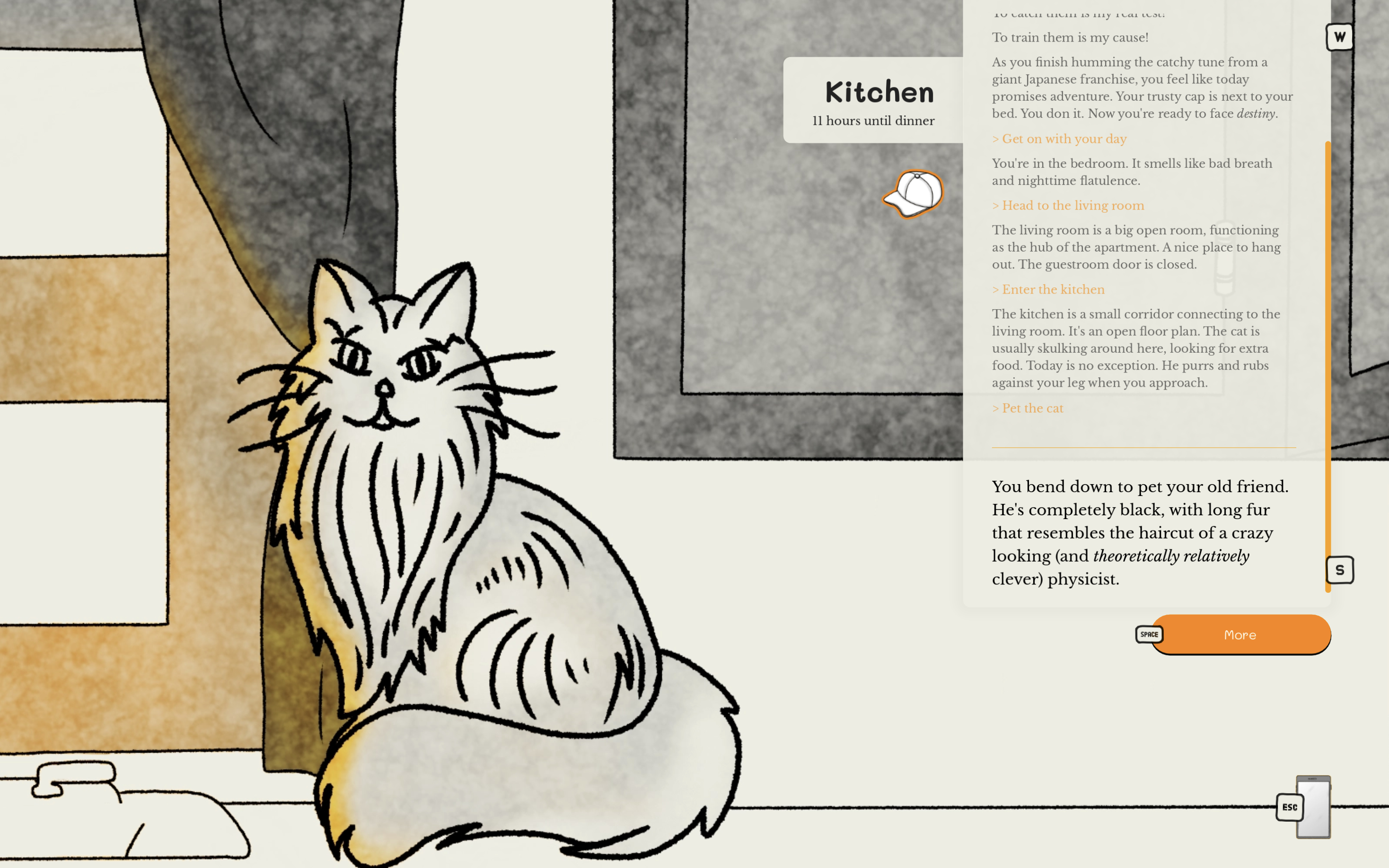 You have a child. It is your job to make sure it thrives, or at least make it through the day. You can go skating, imaginary monster hunting, or just sleep the day away in this text based adventure. I mean, the game reacts to your actions, so it really is possible. But should you?